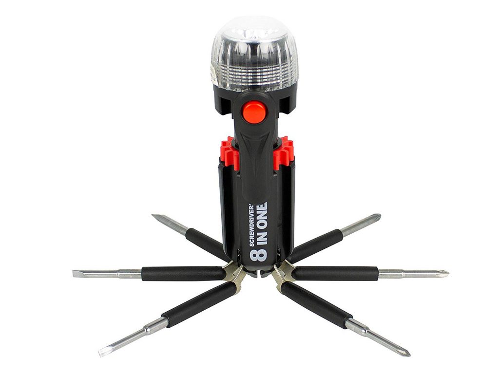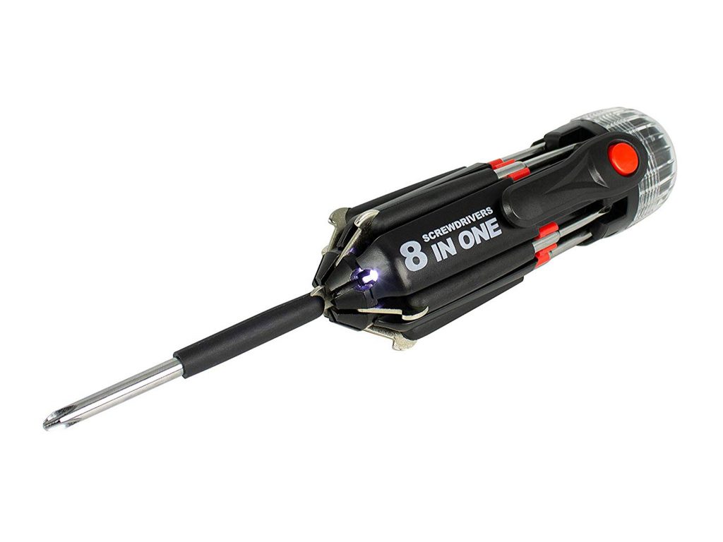 The Tool Tech 8-in-1 Multi-Tool with Torch has 8 different screw driver tools covering all options. It also has a torch (powered by 2 x AAA batteries) and a handle that allows all the tools to fit into the grip making it easy to store and move around.